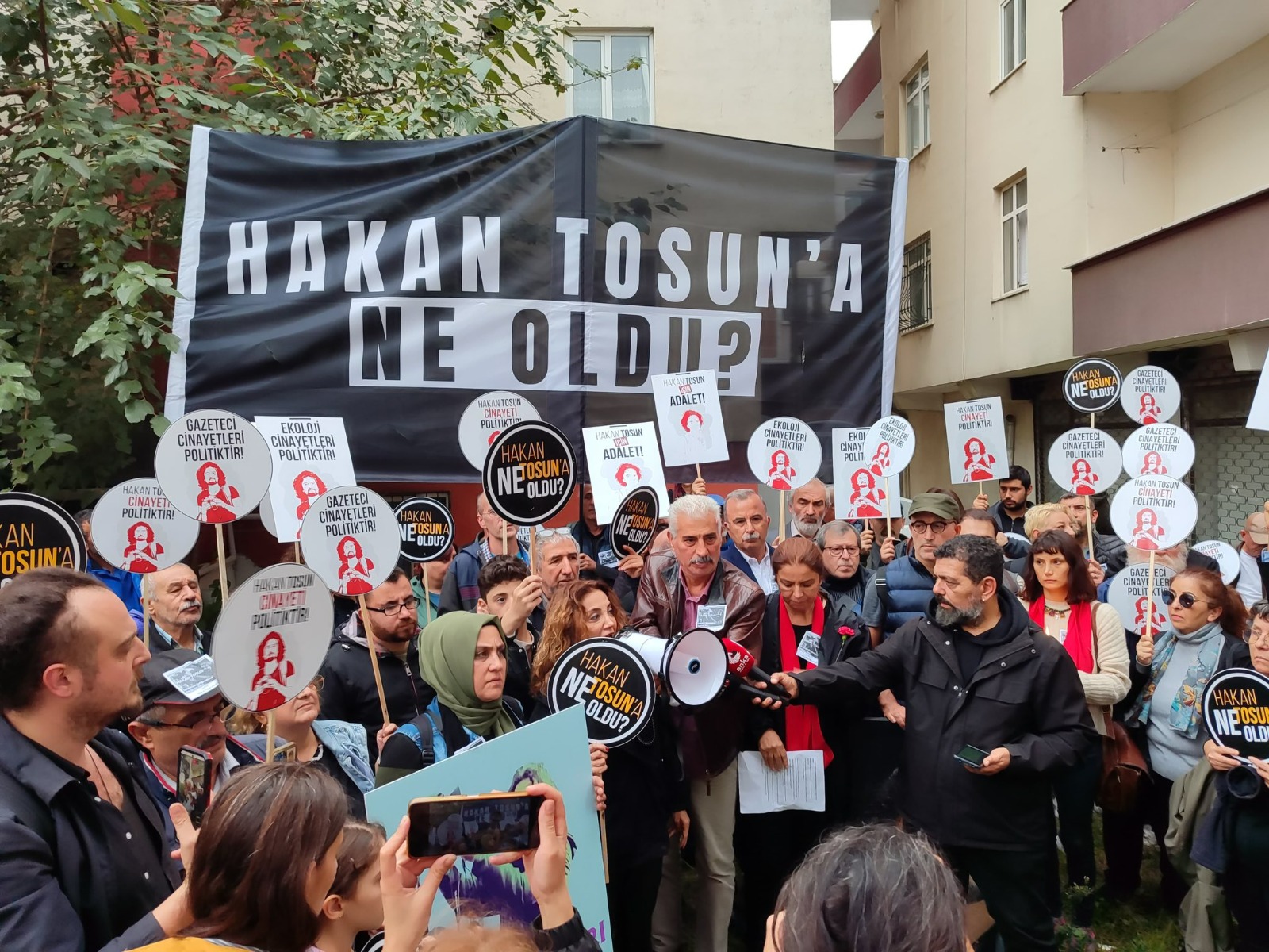 Katılımcılar, olay yerine karanfiller bırakıp mumlar yaktı; Hakan Tosun’un fotoğraflarını ve üzerinde “Hakan Tosun’a ne oldu?” yazılı dövizleri sokağa bıraktı.