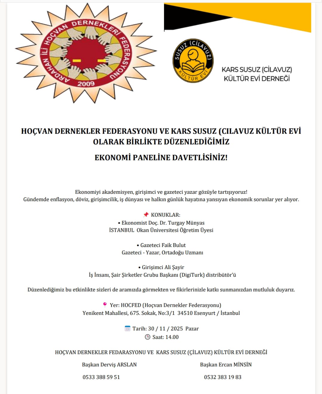 Etkinliğin organizasyonunda Hoçvan Dernekler Federasyonu Başkanı Derviş Arslan ve Kars Susuz (Cilavuz) Kültür Evi Derneği Başkanı Ercan Minsin yer alıyor.
